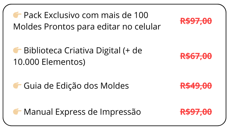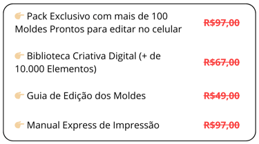 Mas agora você pode ter acesso ao Pack de Moldes Editáveis no Celular junto com todos os bônus por apenas:
